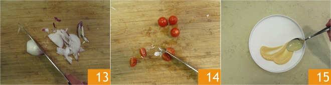 Limpiad y cortad en rodajas finas el cebollino 13, lavad y cortad los tomates cherry 14. Luego podéis emplatar: colocad un poco de mayonesa en el plato 15