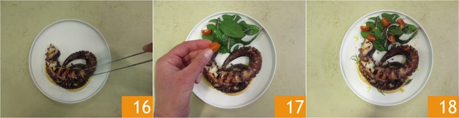 Colocad el pulpo sobre su mayonesa 16, añadid la guarnición de ensalada verde, tomates cherry y cebollino 17. Sazonad los tentáculos con hinojo y ralladura de limón, aliñad la ensalada con un chorrito de aceite de oliva virgen extra y vuestro plato está listo 18!