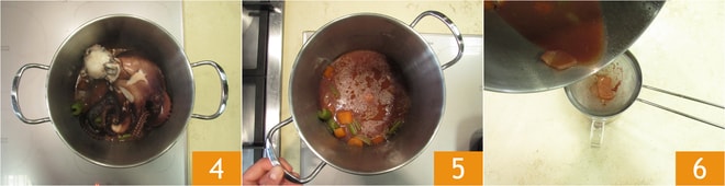 Una vez listo 4, sacad el pulpo y colocadlo sobre una tabla de cortar, dejad enfriar. Reservad 100 g de agua de cocción, filtradla y vertedla en un vaso alto 7 6.