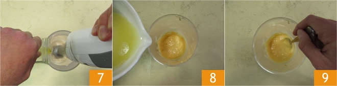 Para hacer la mayonesa, comenzad a emulsionar el agua de cocción 7, vertiendo el aceite de oliva virgen extra en un hilo poco a poco 8, hasta obtener la consistencia adecuada, lisa y densa 9.