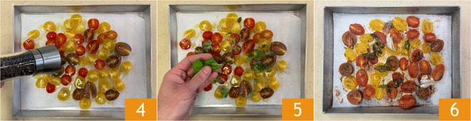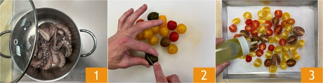 Pon el pulpo, ya limpio, en una olla y cocínalo en seco, con tapa, durante 40 minutos 1. Mientras tanto, corta los tomatitos por la mitad 2 y colócalos en una bandeja cubierta con papel de horno 3.