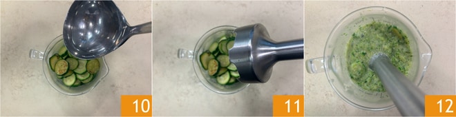 Pásalos a una batidora, añade un poco de agua 10, un chorrito de aceite y bate 11 hasta obtener una crema suave y homogénea 12, reserva.