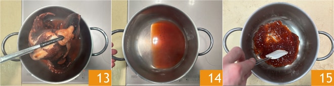 Una vez que el pulpo esté cocido, sácalo de la olla 13 y déjalo enfriar completamente. Mientras tanto, deja el líquido de cocción en el fuego 14 y reduce a más de la mitad 15.