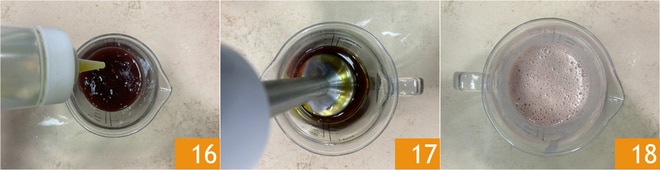 Pásalo a una batidora, añade el aceite 16 y bate 17 hasta obtener una salsa no demasiado espesa 18. Para regularte con las medidas ten en cuenta que la cantidad de aceite debe ser el doble de la cantidad de líquido reducido.