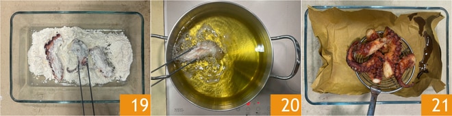 Una vez frío, corta el pulpo en trozos, pásalos por harina de arroz 19 y fríelos en aceite de cacahuete, a 180°C, durante unos minutos, deben quedar crujientes 20. Escúrrelos sobre papel absorbente para eliminar el exceso de aceite 21.