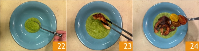 Ahora sirve: en el fondo del plato coloca la crema de calabacines 22, continúa con el pulpo frito 23 y los tomatitos 24.