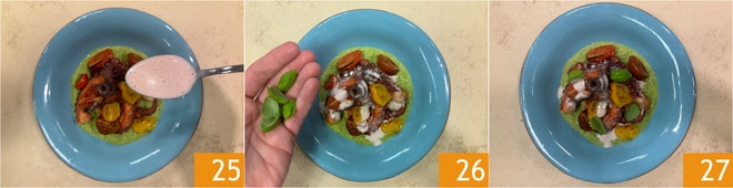 Completa con una cucharada de salsa 25 y algunas hojas de albahaca 26. El pulpo frito gourmet está listo para ser disfrutado 27.