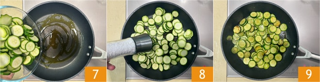 Corta los calabacines en rodajas y ponlos en la sartén con un chorrito de aceite 7, ajusta la sal y la pimienta 8 y cocina hasta que estén dorados 9.