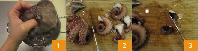 Para preparar el pulpo y judías guisadas, empieza con el molusco, ya eviscerado y limpio. Sumérgelo en abundante agua salada durante unos 30 minutos 1. Si prefieres, también puedes sumergir los tentáculos 2-3 veces antes de cubrir completamente el pulpo, para que se ricen mejor. Pasado el tiempo indicado, escúrrelo, pero no tires el agua, y córtalo en trozos 2 teniendo cuidado de reducir los más grandes en trozos más pequeños 3.