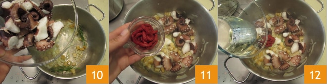 el pulpo 10 y el concentrado de tomate 11. Mezcla todo bien y riega con el vino blanco 12.