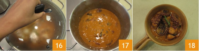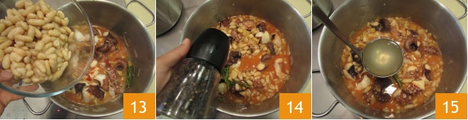 Deja evaporar la parte alcohólica (unos instantes), después podrás agregar las judías 13 y ajustar a gusto con sal y pimienta 14. Riega con un poco de agua de cocción del pulpo para continuar la cocción 15.