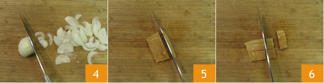 Pela y corta la cebolla finamente 4 y luego corta primero en tiras de un par de cm 5 y finalmente en cubos la corteza bien limpia del Grana Padano DOP 6.