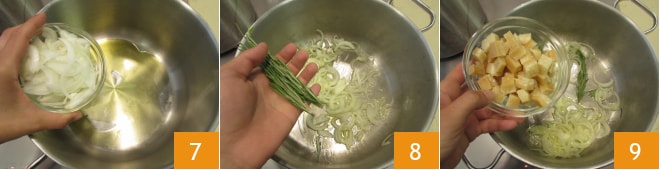 Mueve a la cocina y vierte la cebolla en un chorrito de aceite dentro de una olla grande 7. Déjala sofreír y aromatiza con las ramitas de romero 8. Luego añade los trozos de corteza de Grana Padano DOP cortados 9,