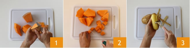 Para preparar el puré de calabaza comienza con su limpieza, para obtener 700 g de pulpa. Córtala en rodajas y elimina la piel 1, redúcela a cubos 2. Haz lo mismo con las patatas primero pelándolas 3