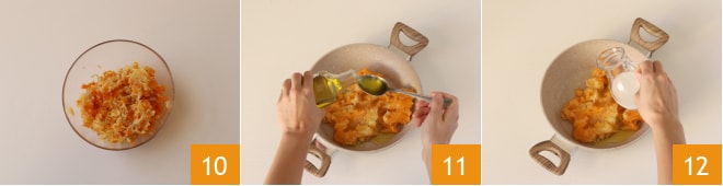 y obtén un puré 10. Transfiérelo a una olla y agrega el aceite 11, la leche 12,