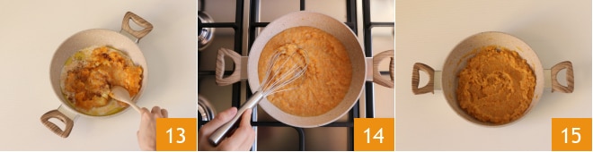 y luego adorna con canela, sal y pimienta 13. En este punto ponlo al fuego a llama suave y mezcla con una varilla durante unos minutos, para que el compuesto resulte homogéneo y cremoso 14. Apaga y disfruta del puré de calabaza bien caliente 15.