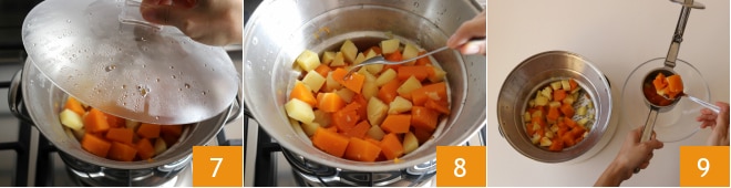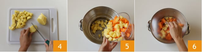 y luego cortándolas en cubos 4. Vierte calabaza y patatas en una vaporera 5, coloca en una olla con agua hirviendo y cubre con la tapa 6.
