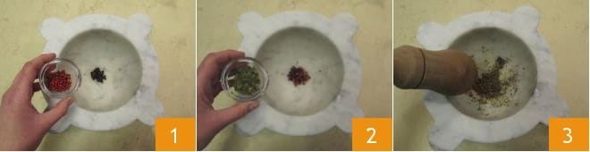 Para realizar el queso vegano untable poned en el mortero los dos tipos de pimienta 1 y el ajo de oso 2. Presionad bien con el mortero para reducir los ingredientes a polvo 3 y reservad la mezcla de especias obtenida.