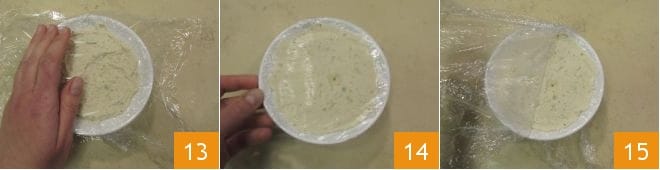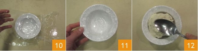 Forra con film transparente un molde redondo o una pequeña fuente de unos 13 cm de diámetro, con un borde alto de unos 6 cm 10 haciendo que se adhiera bien al fondo y las paredes 11. Ahora llena el molde con la mezcla 12 presionando con el dorso de una cuchara, para compactarlo lo mejor posible.