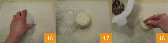 Ahora vuelve a forrar el molde con el film y guarda el queso en el molde (19-20). Deja reposar en la nevera durante otra hora, luego desmolda el queso del molde 21