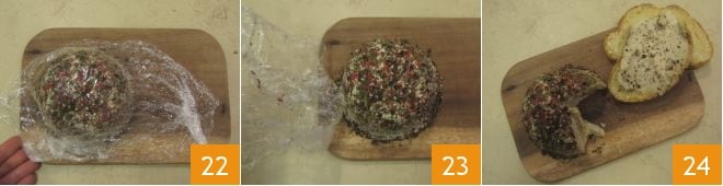 Retira también el film (22-23) y deja el queso vegano en la nevera durante 2 horas antes de servirlo 24.