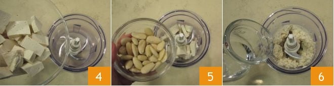 Pon en la batidora el tofu 4 y las almendras 5, activa la batidora para triturar groseramente los ingredientes y luego vierte el agua 6