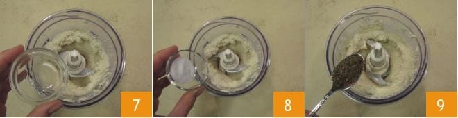 y da otra vuelta de cuchillas para obtener una mezcla homogénea, en este punto vierte el jugo de limón 7, la sal 8 y una cucharadita de la mezcla de especias 9. Mezcla para amalgamar la masa.