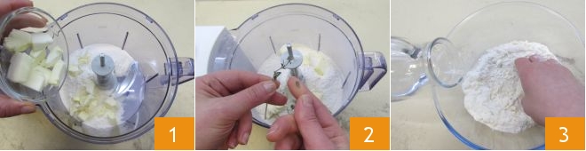 Para preparar la quiche de espárragos y mortadela empieza con la masa brisa. Coloca en un procesador de alimentos equipado con cuchillas la harina tamizada junto con la mantequilla fría en trozos 1; añade una pizca de sal y mezcla todo hasta obtener una mezcla de aspecto arenoso y harinoso. En este punto, aromatiza la masa con hojitas de tomillo 2 y amasa rápidamente, añadiendo poco a poco el agua fría 3.