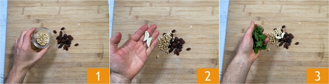 Para preparar el ragú a la napolitana, lo primero que hay que hacer es preparar los rollitos. Coloca en la tabla las pasas (sin remojarlas), los piñones 1, el ajo pelado y sin germen 2 y las hojas de perejil 3. <\/p>