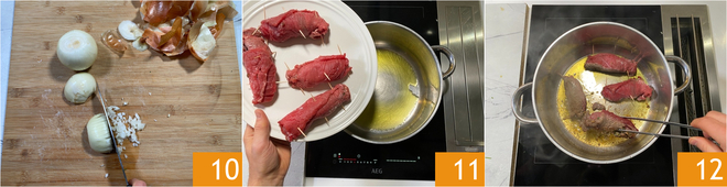 Pela y pica finamente las cebollas 10. Muévete a los fogones. En una cacerola amplia, preferiblemente con fondo doble, calienta un poco de aceite y luego añade los rollitos 11, déjalos sellarse a fuego vivo. Gíralos delicadamente con las pinzas 12, dora bien por todos los lados y luego reserva.<\/p>