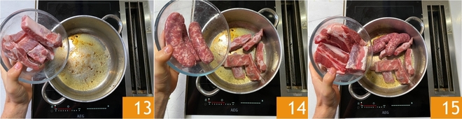 Continúa con los otros cortes de carne, añade primero las costillas de cerdo 13. Luego añade las salchichas 14 y la falda 15.<\/p>