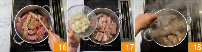 Dora bien todos los trozos de carne 16. En este punto añade la cebolla 17 y sube ligeramente el fuego. Sofríe durante un par de minutos y finalmente añade el vino tinto 18 para desglasar el fondo.<\/p>