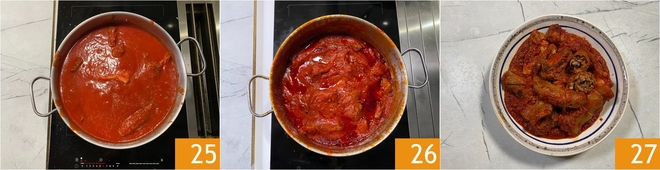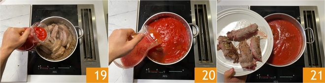 Tan pronto como el alcohol se evapore, añade el puré de tomate 19, enjuaga el recipiente con 2 litros de agua 20 y sumerge los rollitos 21.<\/p>