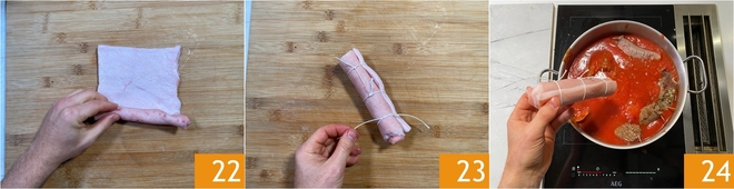 Enrolla la piel 22 atándola con una cuerda 23. Añádela a la salsa 24 y agrega una buena pizca de sal.<\/p>