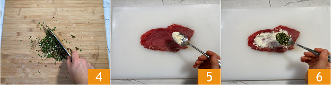 Pica todo bastante fino 4. Extiende una loncha de escalope sobre una tabla; si es demasiado gruesa, golpéala un poco entre dos hojas de papel de horno. Pon encima un poco de queso pecorino romano rallado 5 y la mezcla recién hecha 6; deja un borde libre y no cubras toda la loncha de carne.<\/p>