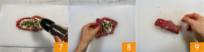Agrega una pizca de pimienta negra 7. Enrolla por el lado más corto de esta manera: dobla hacia adentro los extremos, luego enrolla la carne 8 y asegura los rollitos con unos palillos, dos en los lados 9 y uno en el centro 9.<\/p>