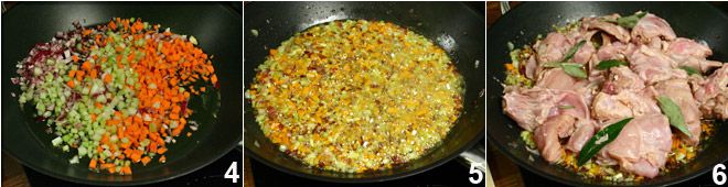 Pasado el tiempo necesario, escurrid el conejo y desechad el vino de maceración. Preparad un picadillo de cebolla, ajo, zanahoria y apio 4 y ponedlo a dorar en el aceite 5, luego incorporad en la cacerola los trozos de conejo 6 y dejadlos dorar a fuego medio junto con los aromas.