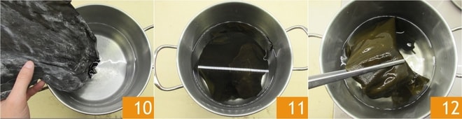 Mientras tanto, remoja el alga kombu en una olla con 3 litros de agua 10 y déjala a temperatura ambiente durante 12 horas 11. Transcurrido este tiempo retira el alga con las pinzas 12 y utiliza el agua para el caldo.