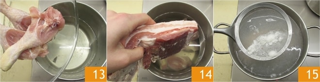 Añade las carcasas de pollo 13 y la panceta de cerdo 14, cubre con la tapa y empieza a cocinar a fuego alto durante unos 15-20 minutos. En este punto elimina la espuma de la superficie 15, luego baja el fuego y cocina sin tapa durante aproximadamente una hora y media.