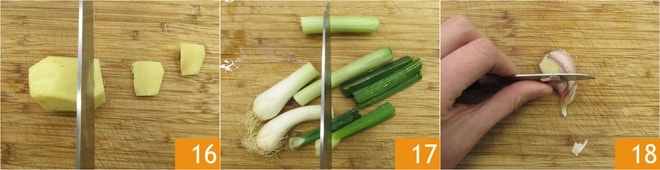 Mientras tanto, prepara los ingredientes que necesitarás tanto para el caldo como para la carne de cerdo: pela y corta el jengibre en trozos 16, luego corta también groseramente la parte verde del cebollino 17. Finalmente pela los dientes de ajo 18.