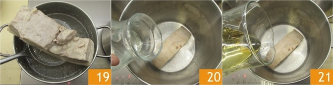 Después de una hora y media verifica que la carne de cerdo esté cocida pinchándola con un tenedor, si no sale sangre puedes retirarla del caldo que deberá continuar cocinándose durante otras 3-4 horas 19. Transfiere el cerdo a otra olla y añade el sake 20 y el mirin 21.