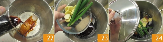 Vierte también el tamari 22, luego añade el jengibre, el cebollino y el ajo 23. Cubre con la tapa y cocina a fuego lento durante 2 horas 24.