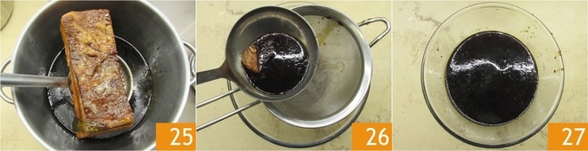 Transcurrido este tiempo retira la panceta de cerdo 25 y resérvala en caliente, luego filtra el líquido de cocción 26 y resérvalo también 27.
