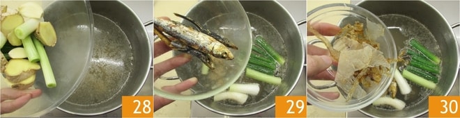 Cuando falte una hora para el final de la cocción del caldo, añade dentro el jengibre, el cebollino y el ajo 28. Añade también los niboshi 29 y continúa cocinando el caldo. Al terminar el tiempo de cocción, apaga el fuego y añade un puñado de katsuobushi 30.