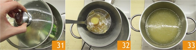 Cubre con la tapa 31 y deja en infusión durante 15 minutos. Después filtra el caldo con un colador fino 32 y mantenlo caliente 33.