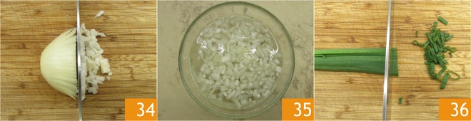 Por último, prepara los ingredientes para componer el plato: corta una cebolla en brunoise 34, sumérgela brevemente en agua fría 35 y escúrrela bien, luego corta finamente la parte verde del cebollino 36.