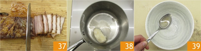 Corta la carne de cerdo en rodajas 37. Mientras tanto, derrite la manteca en un cazo 38 y lleva a ebullición una olla de agua sin sal para cocer los noodles. Empieza a componer los cuencos vertiendo una cucharada de manteca dentro de cada uno 39.