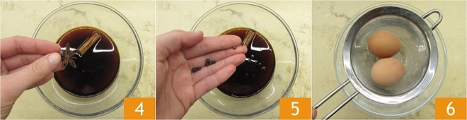 Añade también el anís estrellado 4 y los granos de pimienta 5. Transcurrido el tiempo de cocción, escurre los huevos y transfiérelos a un bol con agua fría 6.