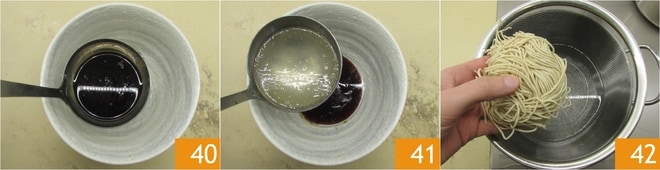 Añade también 2 cucharones del líquido de cocción del cerdo 40 y un cucharón de caldo 41. Sumerge los noodles en el agua hirviendo 42 y cuécelos durante 30 segundos.