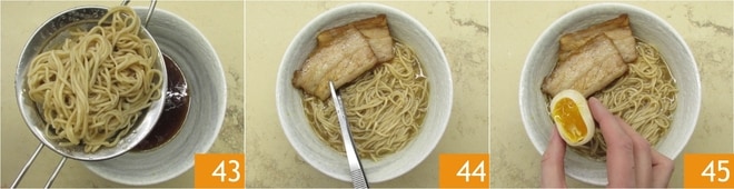 Escurre bien los noodles y viértelos en los cuencos, colocándolos con las pinzas 43. Coloca 2 rodajas de cerdo 44 y el huevo marinado cortado por la mitad a lo largo 45.